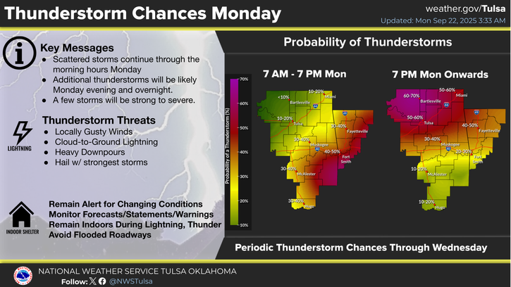 TULSA – The National Weather Service is warning of the potential for severe thunderstorms across parts of eastern Oklahoma and western Arkansas on Monday, Sept. 22, continuing into the overnight hours.